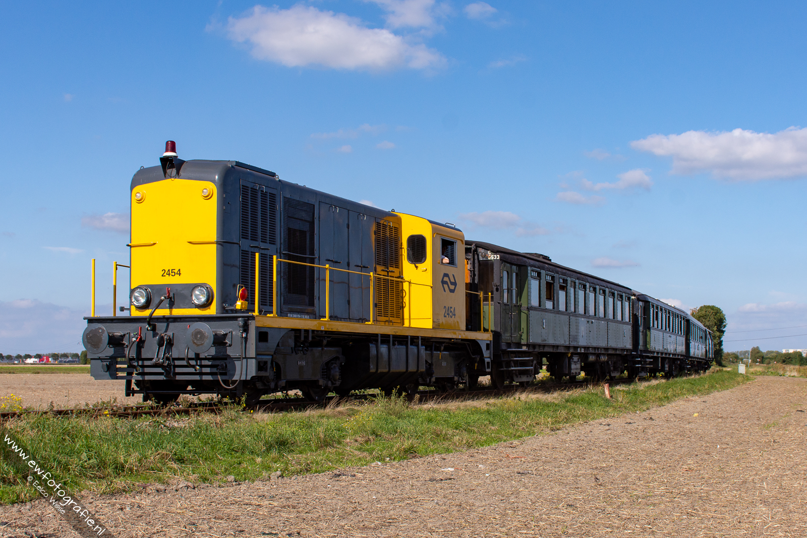 De Diesel loc 2454 met een aantal passagierswagons erachter. De 2454 is gebouwd door Alsthom in 1955. Met zijn 850PK wist hij een maximum snelheid van rond de 80 km/u te halen.