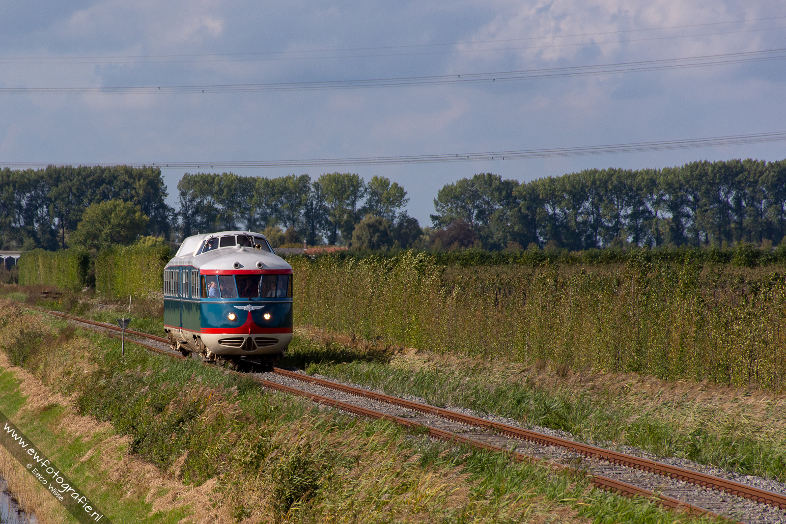 Het Nederlandse diesel electrische motorrijtuig NS 20, ook wel bekend als 'de Kameel', rijdend door de zak van Zuid-Beveland.