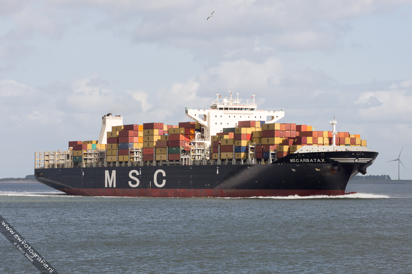 De MSC Arbatax op de Westerschelde bij Rithem, opvarend naar zee.